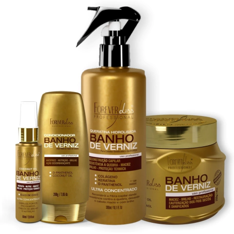 Máscara Banho De Verniz Forever Liss proporciona hidratação intensa, repara a porosidade e sela as cutículas, deixando os cabelos saudáveis e brilhantes por mais tempo. Formulada com Óleo de Coco, D-Pantenol e Phytoqueratina, trata fios opacos, promove maciez e leveza, alinha os cabelos e reduz o frizz, além de fortalecer e realçar a cor. Indicada especialmente para cabelos ressecados e opacos, esta máscara ajuda a prevenir a quebra e revitaliza a beleza dos fios. Cabelos nutridos, brilhantes e sedosos. Modo de uso: Logo após lavar os cabelos com o Shampoo Banho de Verniz, aplique a Máscara Banho de Verniz nos fios ainda úmidos, espalhando em todo o comprimento. Distribua uniformemente, penteando os fios para melhor penetração do produto. Deixe agir por 10 minutos. Enxágue até retirar o produto por completo. Finalize como desejar.